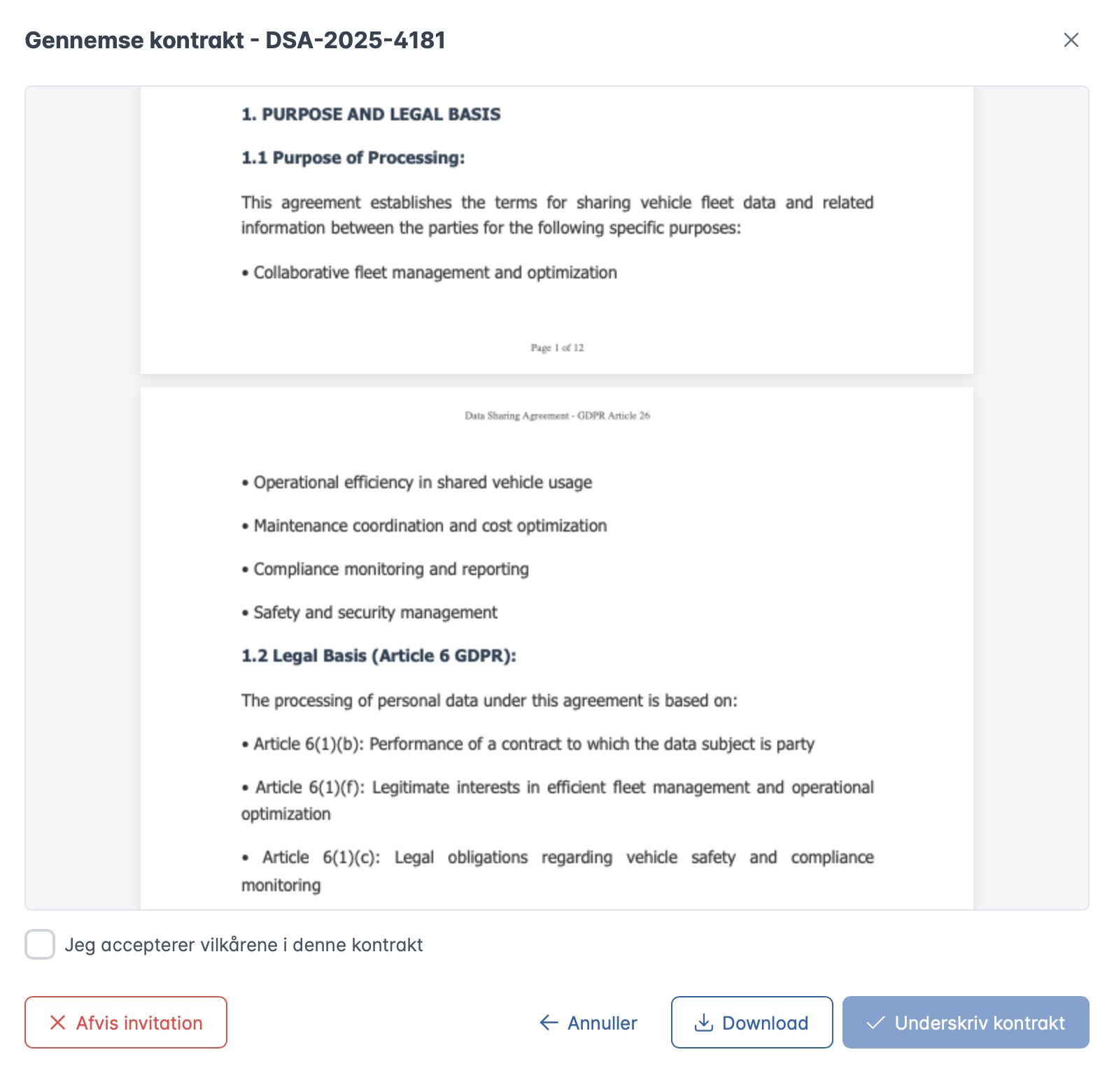 Partneren modtager en emailinvitation, klikker på linket og ser den fulde Article 26 kontrakt. Efter gennemlæsning markerer partner accepter og klikker derefter "underskriv kontrakt" for at underskrive digitalt. Aktiv bruger, IP-adresse og tidsstempel registreres automatisk for fuld sporbarhed.