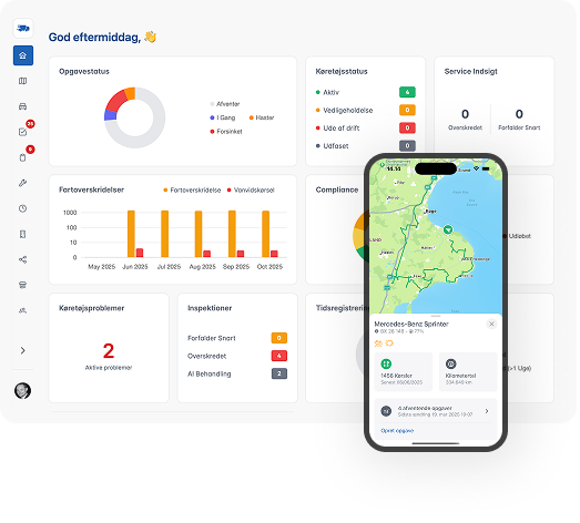Se status på alle biler på ét dashboard. Hvilke har problemer? Hvilke skal til service? Hvem kører hvad? Alt samlet ét sted.
